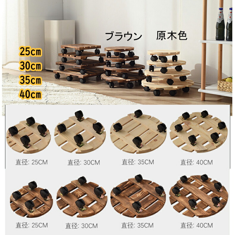 植木鉢台 木製鉢置台 キャスター付き 25cm 30cm 35cm 40cm 原木色 ブラウン