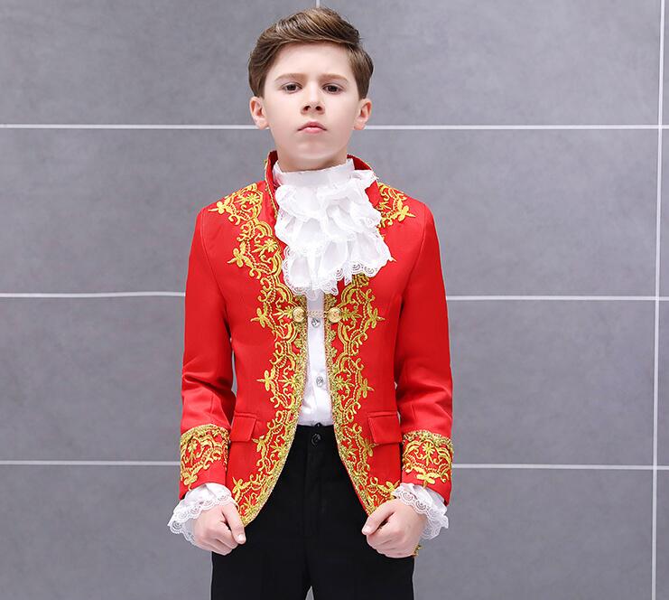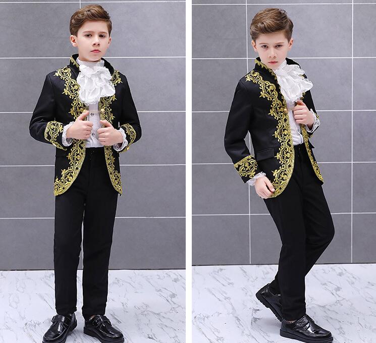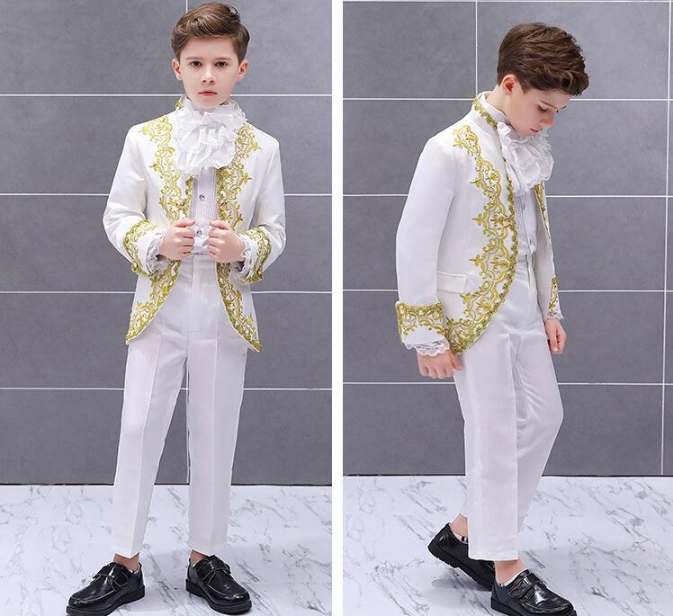 子供スーツセットアップ4点セット 男の子舞台ステージ衣装 貴族衣装 王子様コスチューム ミュージカル衣装 欧米王子様コスプレ舞台スーツ 舞台衣装 欧風 ヨーロッパ風 花柄刺繍 王族服 貴公子 公 王様