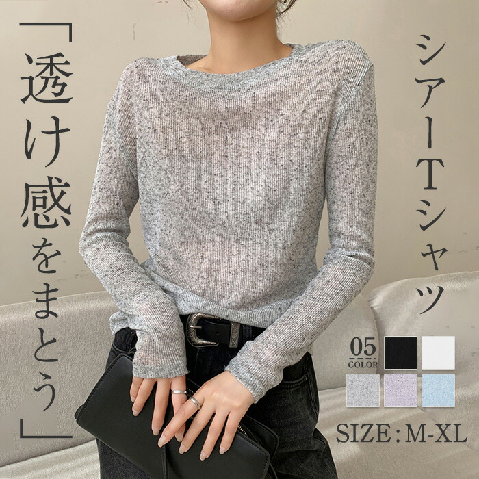 カットソー 長袖 レディース ブラウス トップス 薄手 ロングTシャツ シアー 透け感 クルーネック レイヤード インナー シースルー 華奢見せ 重ね着 UV対策 ゆったり 体型カバー 無 紫外線対策