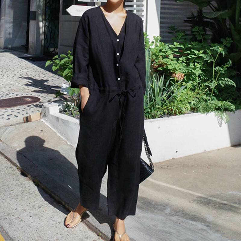 【新丈登場】綿麻風 オールインワンパンツ きれいめ 黒 杏色 ブラック ベージュ ゆったり シンプル 高身長対応 低身長対応 レギュラー丈 ロング丈 20代 30代 40代 50代 送料無料 ♪