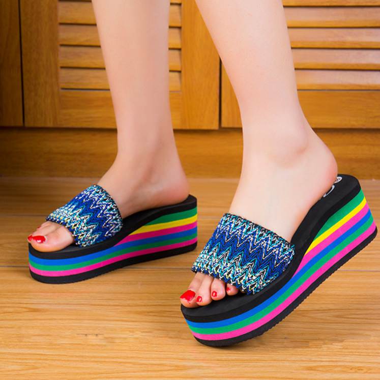 サンダル レディース シューズ 厚底 送料無料 個性的 スリッパ マルチカラー 青 赤 黒 緑 22.0 22.5 23.0 23.5 24.0 24.5 25.0 レインボー カラフル 春 夏 カジュアル エスニック レトロ
