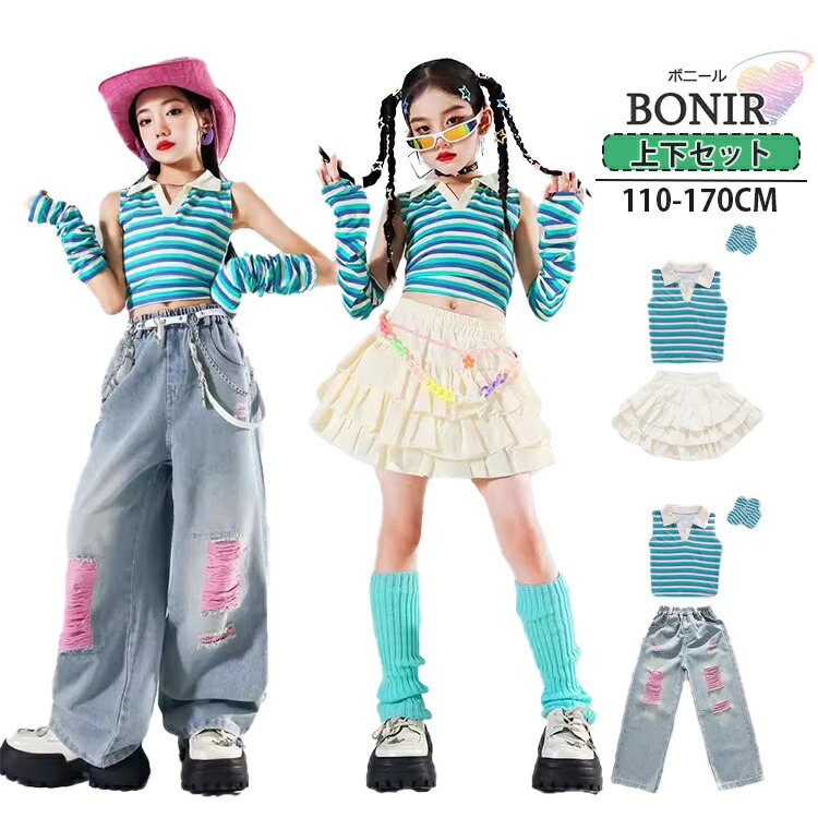 キッズ ダンス衣装 ストライプ ジャズ 女の子 ガールズ ボーダー柄 青 無袖 ダンス ズボン デニムズボン アームカバー スカート Y2K ダンスウェア 応援団 イベント ジュニア 発表会