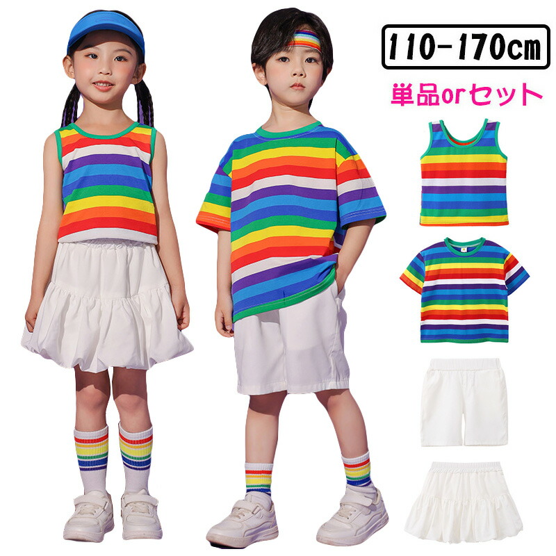 女の子 男の子 チア チアガール キッズ ダンス衣装 セットアップ 虹色 カラフル レインボー 半袖 Tシャツ タンクトップ スカートパンツ 短パン 応援団 発表会 k-pop ジャズダンス ヒ 韓国