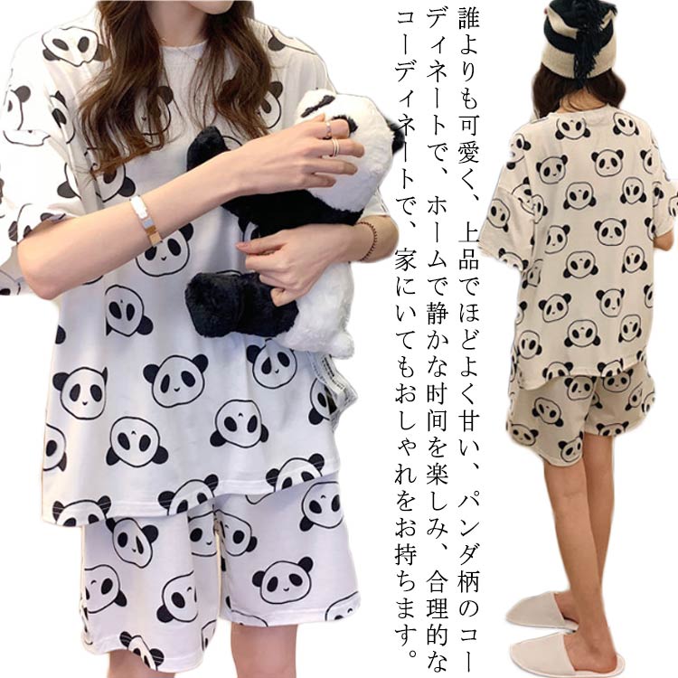 送料無料 レディース パジャマ 半袖 パンダ柄 上下セット 可愛い 春 夏 ルームウェア ゆったり 女の子