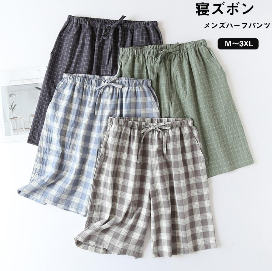 パジャマ ルームウェア パンツ メンズ チェック ズボン イージーパンツ ルームパンツ 綿100% 春 夏 ボトムス ゆったり ハーフパンツ 部屋着 寝巻き ポケット ひも ガーゼ リラ ウエストゴム