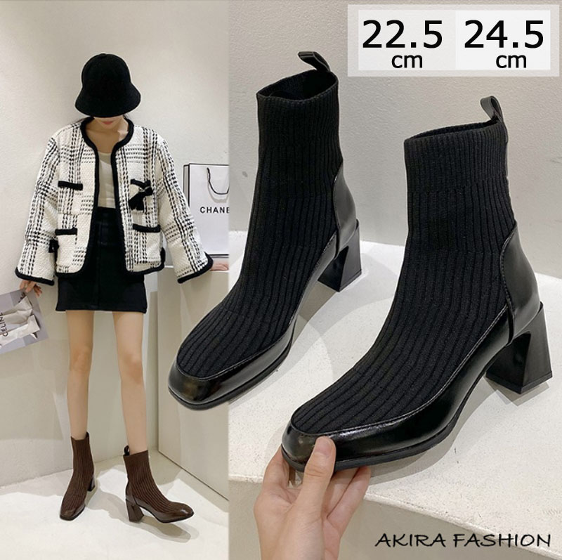 ソックスブーツ レディース ニット ブーツ ショートブーツ スクエアトゥ ストレッチ ショート 異素材 切替 7センチヒール デザインヒール 太ヒール ブラック ブラウン 伸縮 低反発 秋冬 柔らか