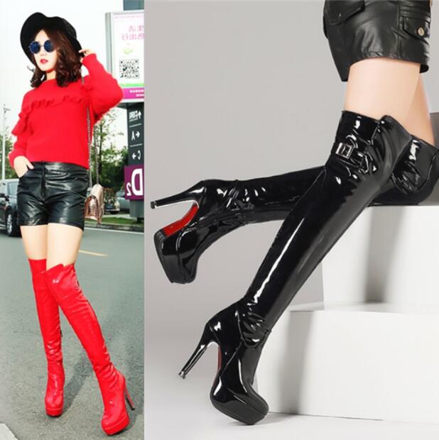 レディースブーツニーハイブーツエナメル11.5センチ超ハイヒール光沢ロング丈秋冬春秋サイハイブーツ大きいサイズ26.5cmまで小さいサイズ ピンヒールスーパーロングブーツ ダンス舞台
