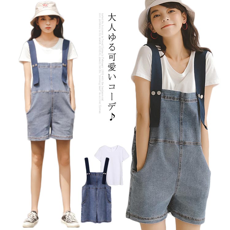 マタニティウェア サロペットパンツ ショーツパンツ 2点セット ストレッチ デニム サロペットショートパンツ 半袖Tシャツ 可愛い ガーリー 20代 30代 おしゃれ