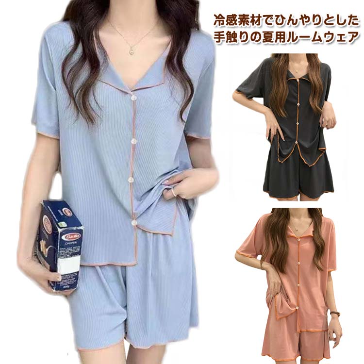ルームウェア ショートパンツ 春夏 冷感 デイリー 通気性 前開き 上下セット 2点セット トップス 短パン 可愛い パジャマ 半袖 部屋着 寝巻き 薄手 ウエストゴム フロントボタン 開襟 ゆったり
