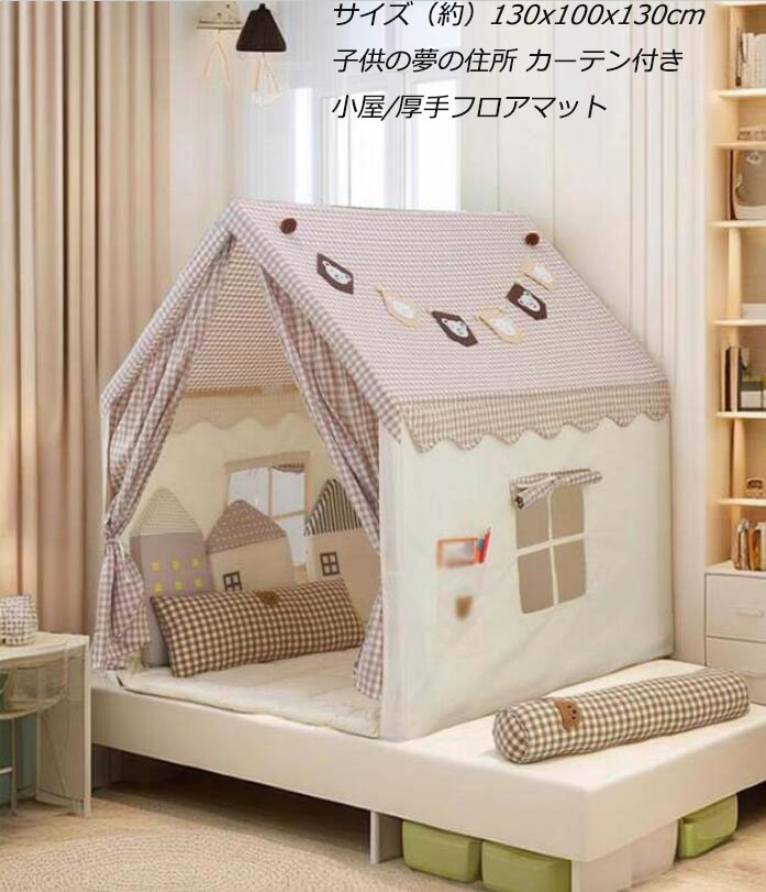 4点セット キッズテント 子供部屋 プレゼント 子供テント キッズ プレイテント 組み立て簡単 室内室外 小屋+厚手フロアマット+ カーテン付き 天然木ブラケット 窓つき 通気性 扉つき