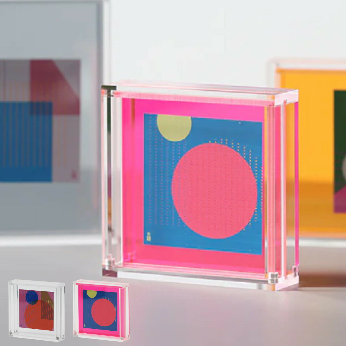 「思い出彩るカラフルフォトフレーム」まるでガラスのような透き通るアクリル素材でカラフルに仕上げました。どんなお部屋にも合うので、プレゼントにもおすすめです。