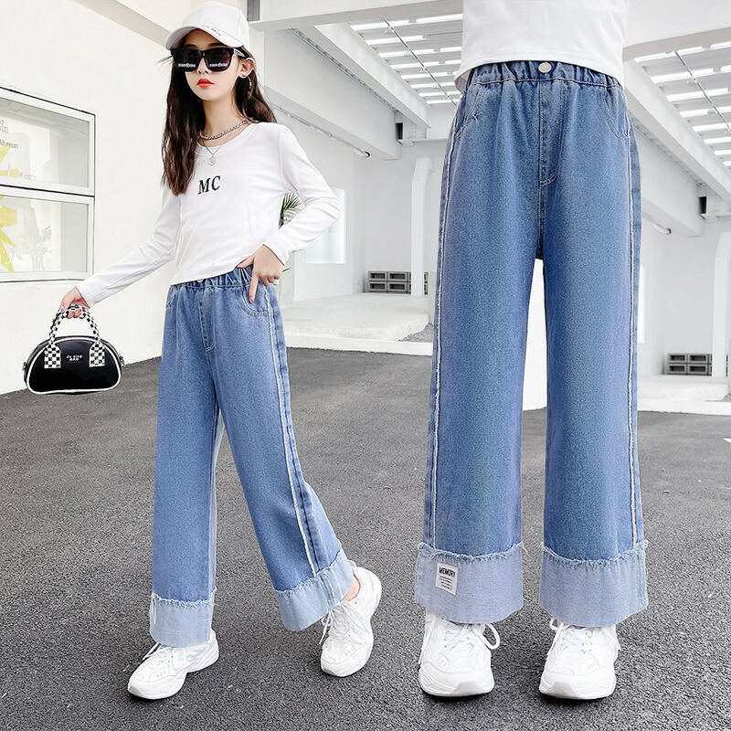キッズ デニムパンツ 子供 ロングパンツ 春秋 ジュニア ジーンズ フレアパンツ 長ズボン ジーパン 女の子 子ども 学生 可愛い 子供服 ワイドパンツ 発表会 通園 通学 カジュアル ゴムウエスト