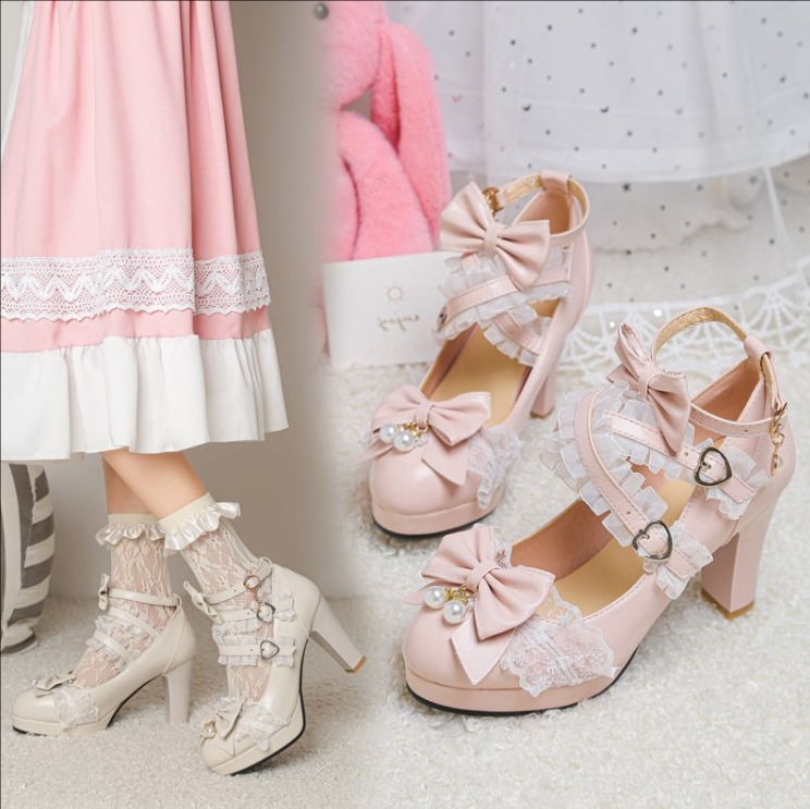 ロリータ 靴 ヒール パンプス 厚底 ロリータシューズ パンプス 靴 丸トウ お嬢様 美脚 履きやすい ロリータ 太ヒール リボン ストラップ パンプス コスプレ
