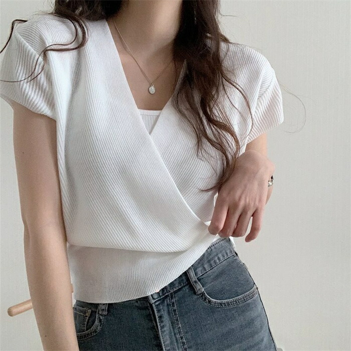 サマーニット レディース リブニット 半袖 ニットトップス 無地ニット トップス プルオーバー ラウンドネック 角首 リブ編み ストレッチ 伸縮性 ショート丈 夏ニット 着痩せ シンプル 薄手ニット