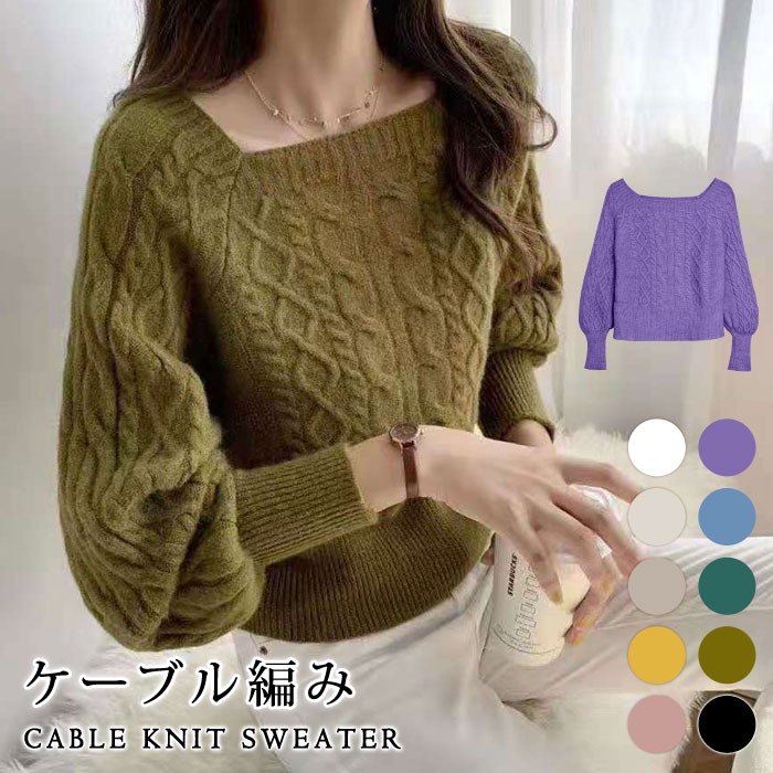 ニットトップス レディース 秋 冬 秋冬 黒 白 ニット トップス 長袖 無地 セーター ケーブル編み ホワイト ブラック イエロー ベージュ ピンク パープル ブルー グリーン カーキ