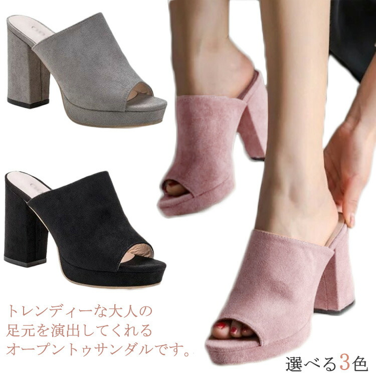 オープントゥ サンダル 太めヒール チ 靴 特集 ブラック ピンク グレー 35 36 37 38 39