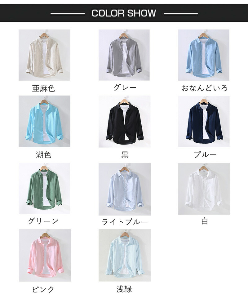 リネン シャツ メンズ 麻 麻シャツ トップス その他 早い者勝ち 亜麻色 グレー おなんどいろ 湖色 黒 ブルー グリーン ライトブルー 白 ピンク 浅緑 S M L XL 2XL 3XL