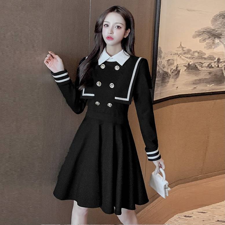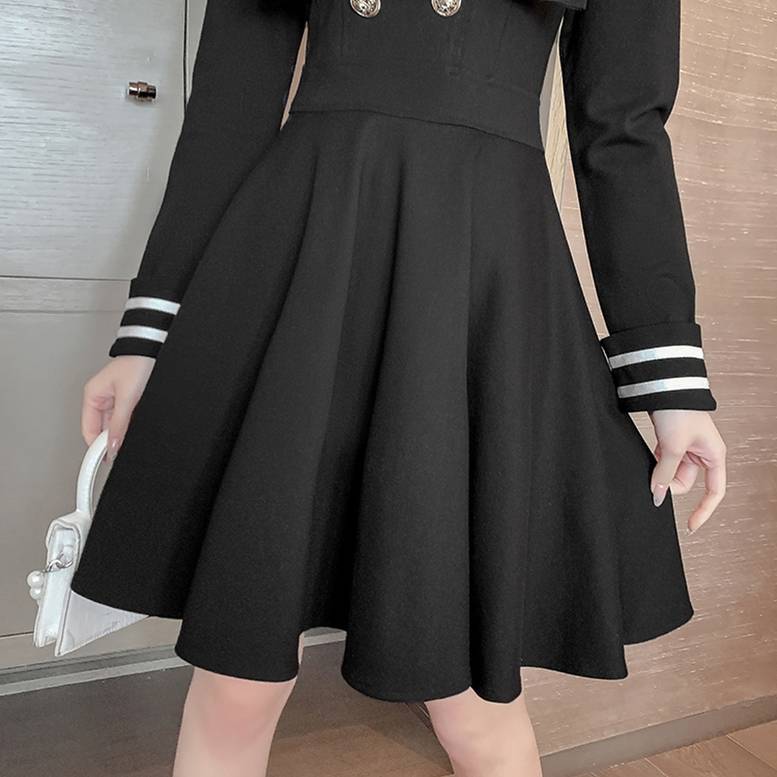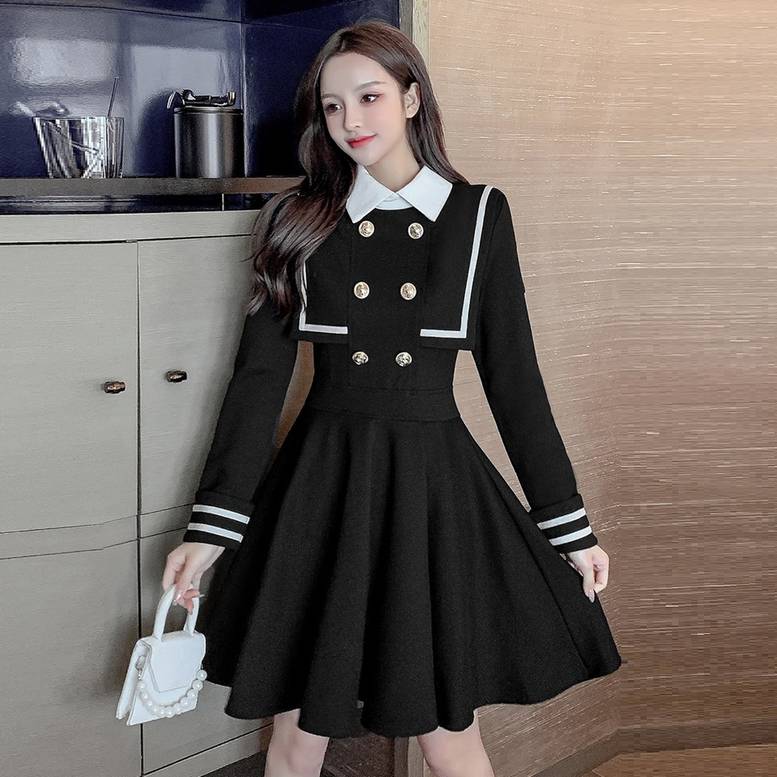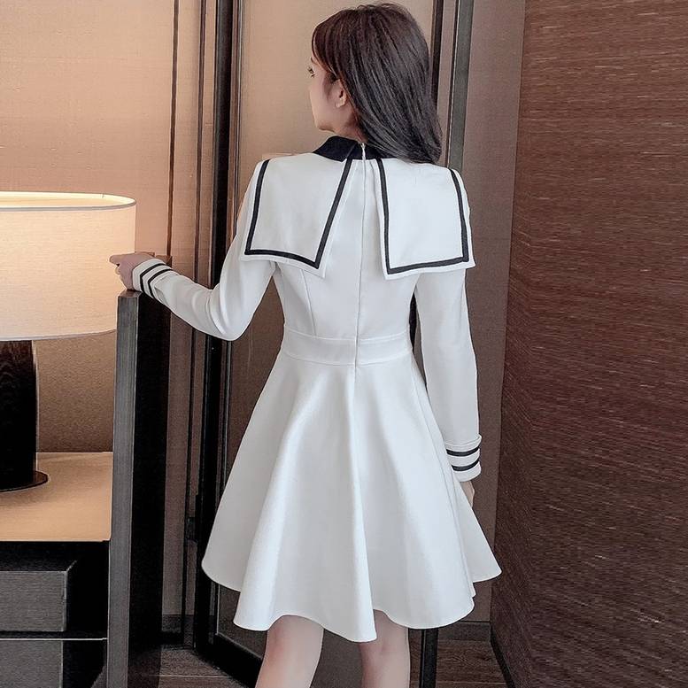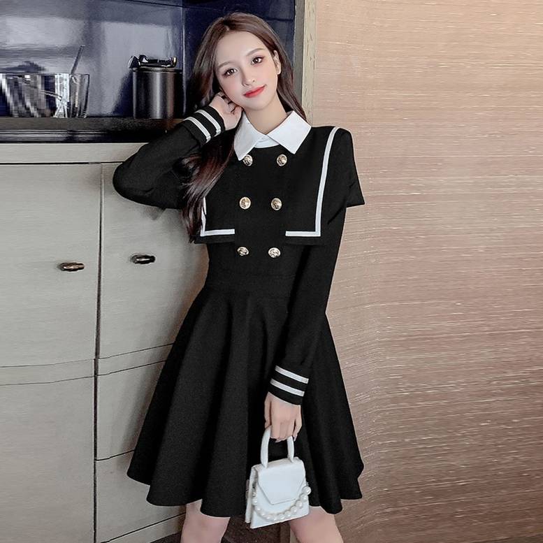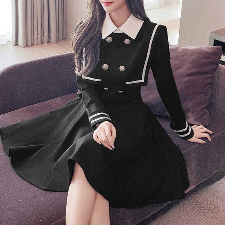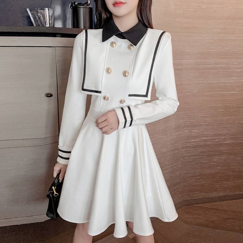 ワンピース ドレス レディース セーラー服 フレア ひざ上 膝上 長袖 ダブルボタン 襟つき コスプレ ゴスロリ おしゃれ かわいい 清楚 お呼ばれ デート S M XL モノトーン バイカラー L