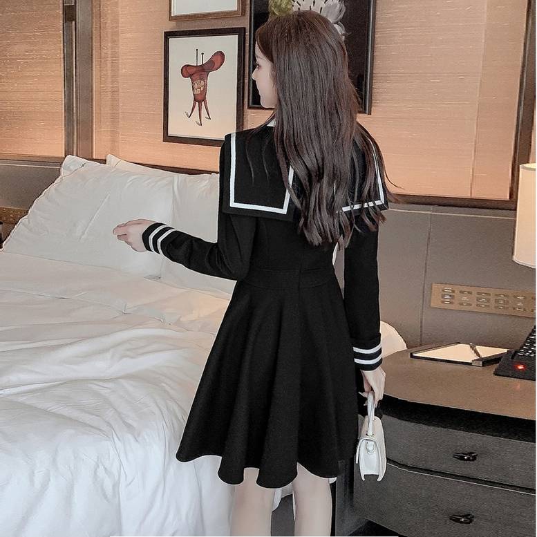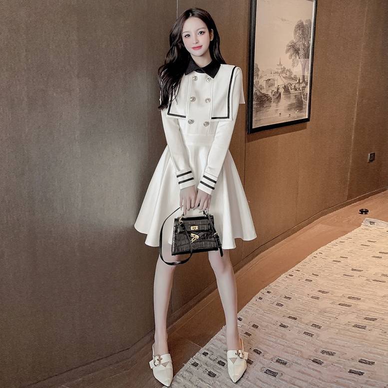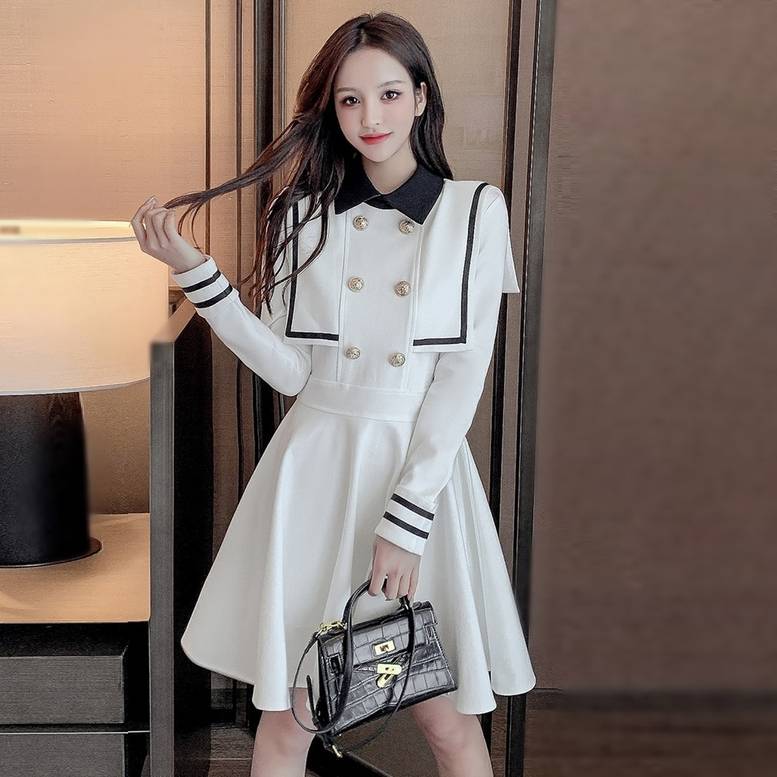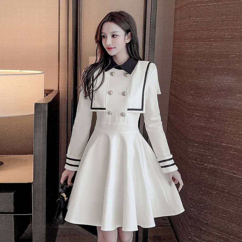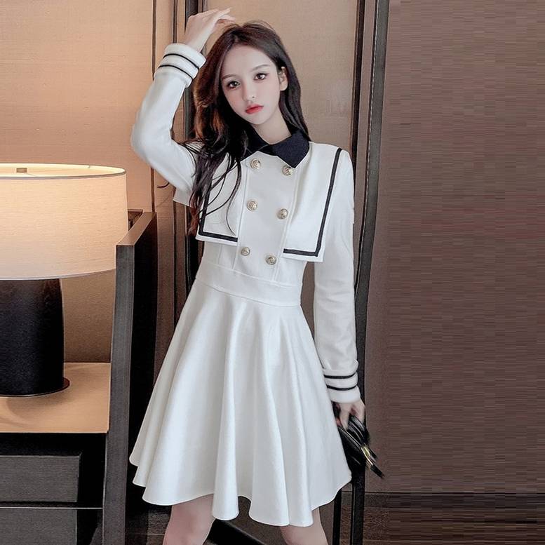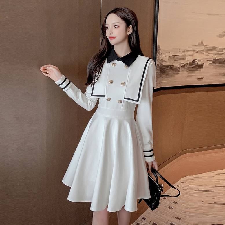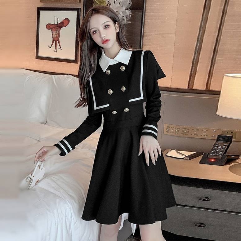 ワンピース ドレス レディース セーラー服 フレア ひざ上 膝上 長袖 ダブルボタン 襟つき コスプレ ゴスロリ おしゃれ かわいい 清楚 お呼ばれ デート S M XL モノトーン バイカラー L