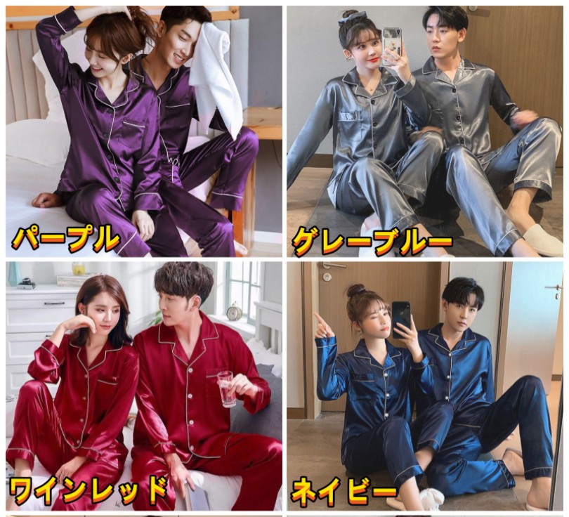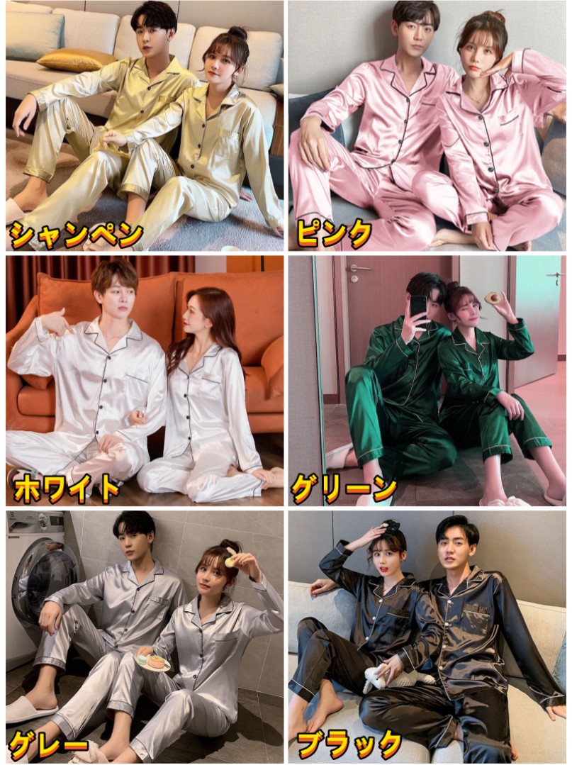 ペアパジャマ サテン カップル 上下セ インナー 下着 ナイトウエア 新登場! ブラック パープル ピンク グリーン ネイビー グレーブルー シャンペン ホワイト ワインレッド グレー 女子Mサイズ 女子Lサイズ 女子XLサイズ 女子2XLサイズ 女子3XLサイズ 女子4XLサイズ 女子5XLサイズ 男子Lサイズ 男子XLサイズ 男子2XLサイズ 男子3XLサイズ 男子4XLサイズ
