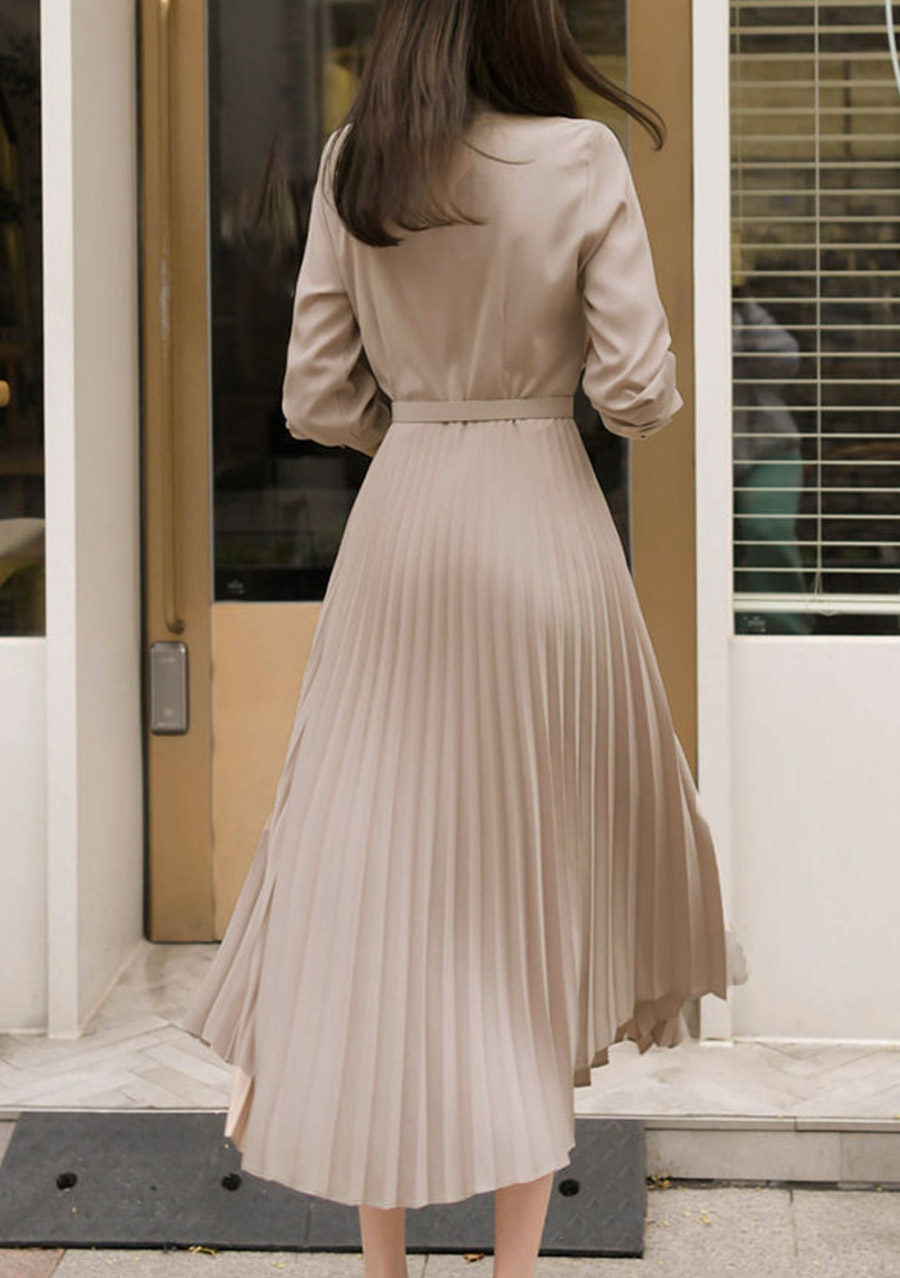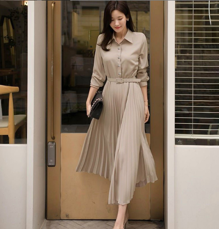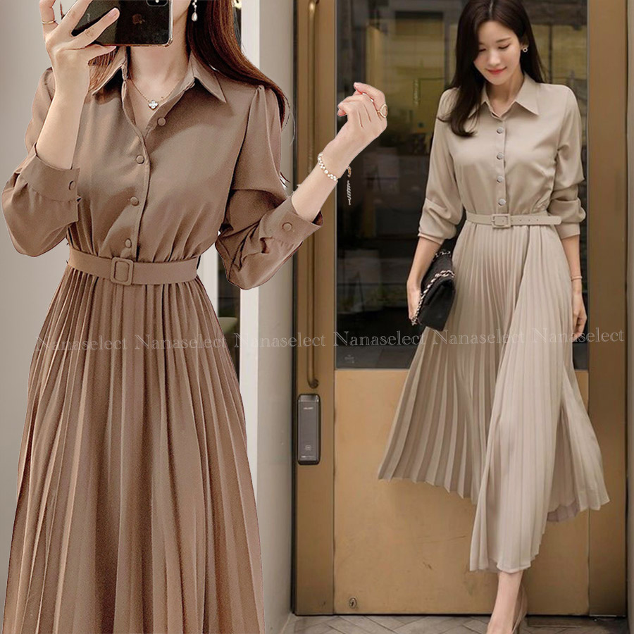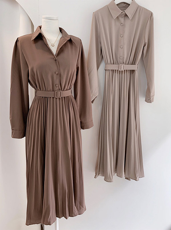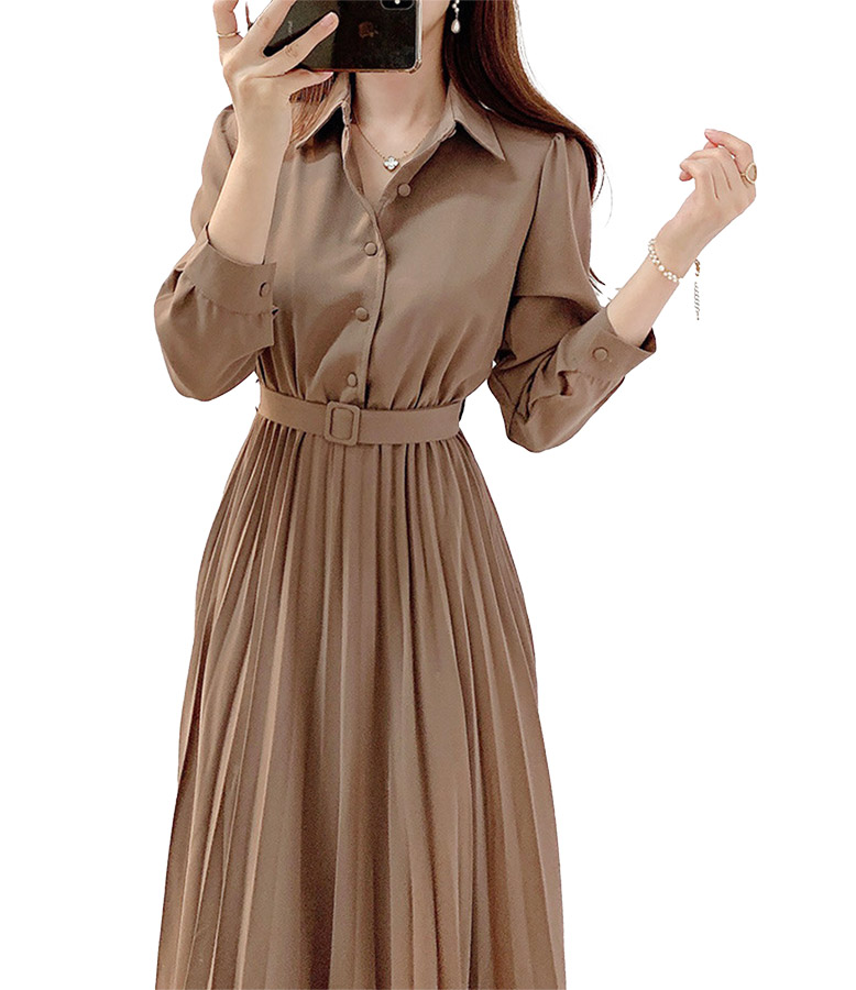 ベルト付き プリーツデザイン 長袖 襟付き ロング ワンピース