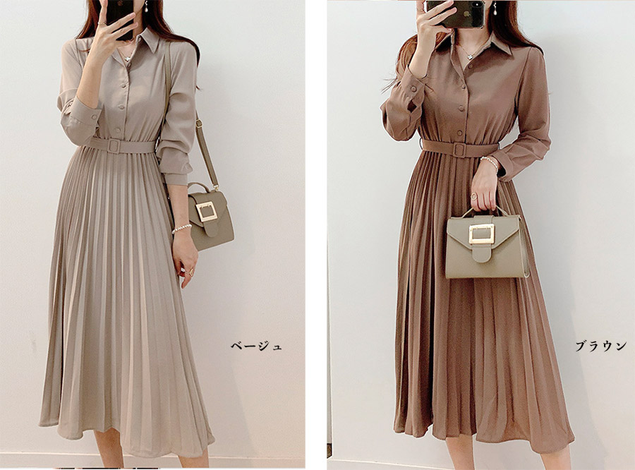 マキシ丈ワンピース シャツワンピ フォーマルワンピース 襟付き プリーツ