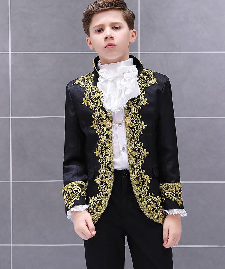 子供スーツセットアップ4点セット 男の子舞台ステージ衣装 貴族衣装 王子様コスチューム ミュージカル衣装 欧米王子様コスプレ舞台スーツ 舞台衣装 欧風 ヨーロッパ風 花柄刺繍 王族服 貴公子 公 王様