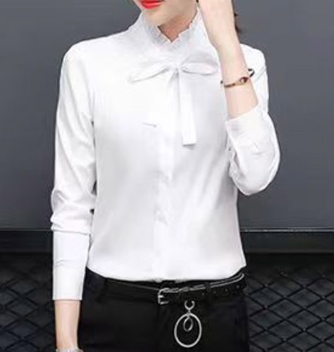 ボウタイデザインが女性らしさを引き立て、スタンドカラーやハイネックの立ち襟がモダンな印象を与えます。