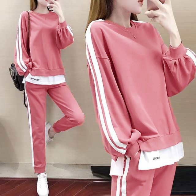 上下 レディース スウェット 重ね着風 スーツ セットアップ パンツスーツ 通販 521ブラック 521グレー 521ピンク 361ブラック 361ピンク 361ブルー M L XL 2XL