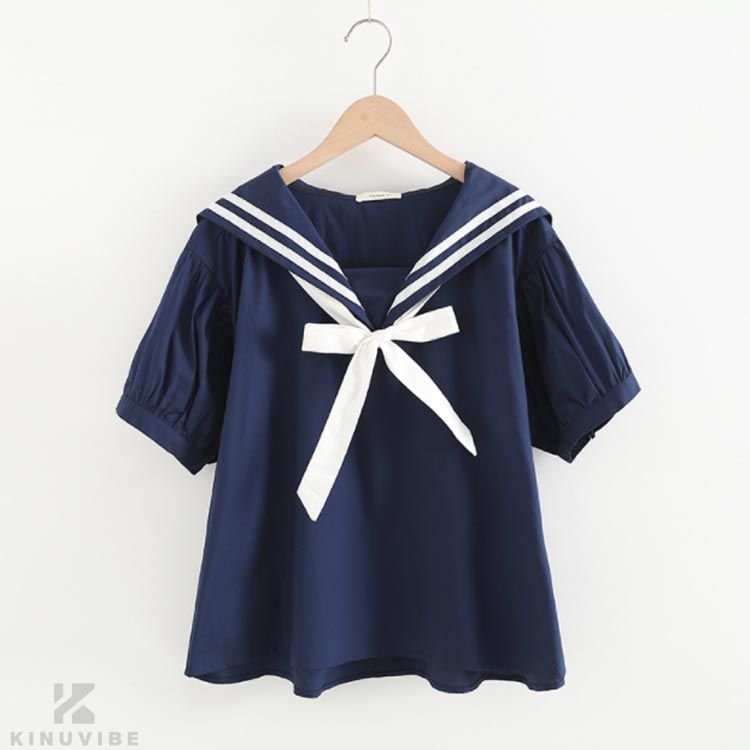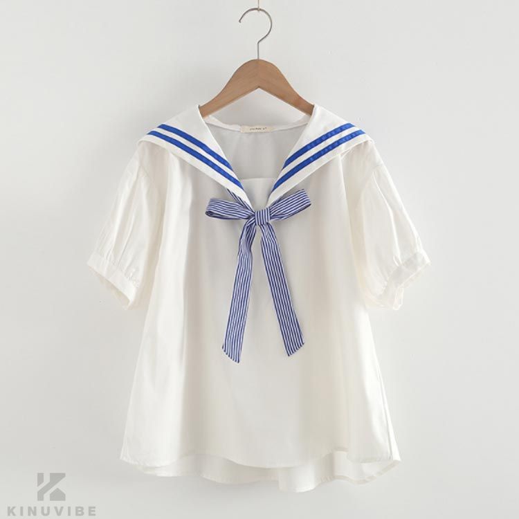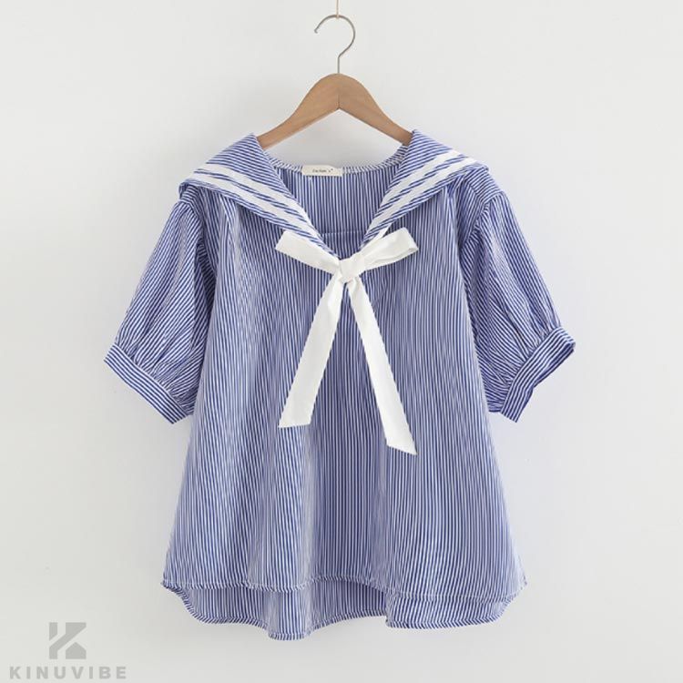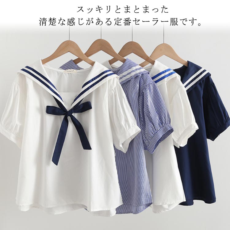 ブラウス 半袖 マリン風半袖 リボン 学生服 セーラー服 早い者勝ち ホワイト/ブルー ホワイト/ネイビー ストライプ ネイビー