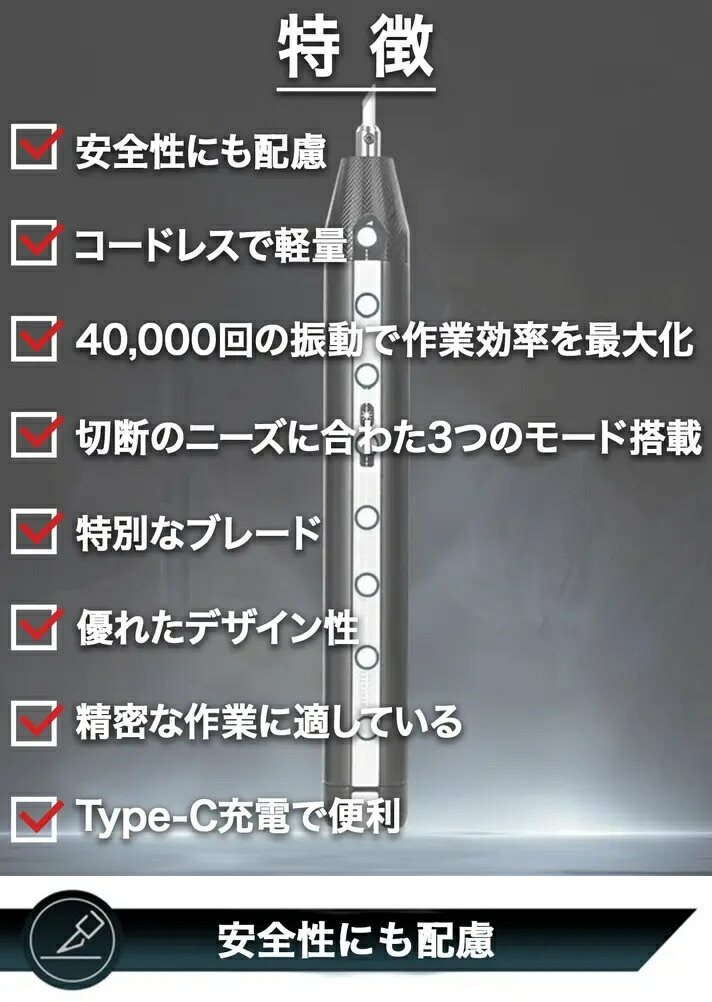 超音波振動が刃を高精度で動かし、少ない力で硬い素材や細かい部分を簡単に切断します。