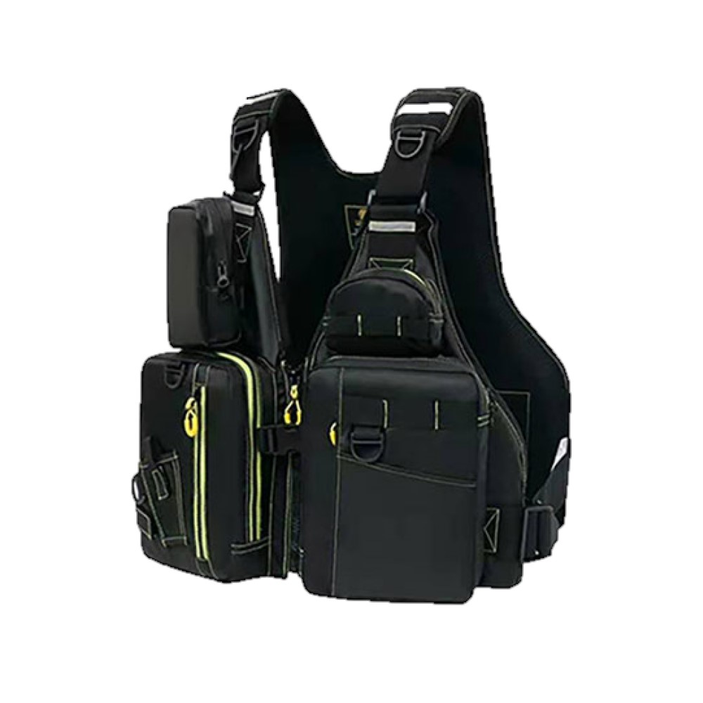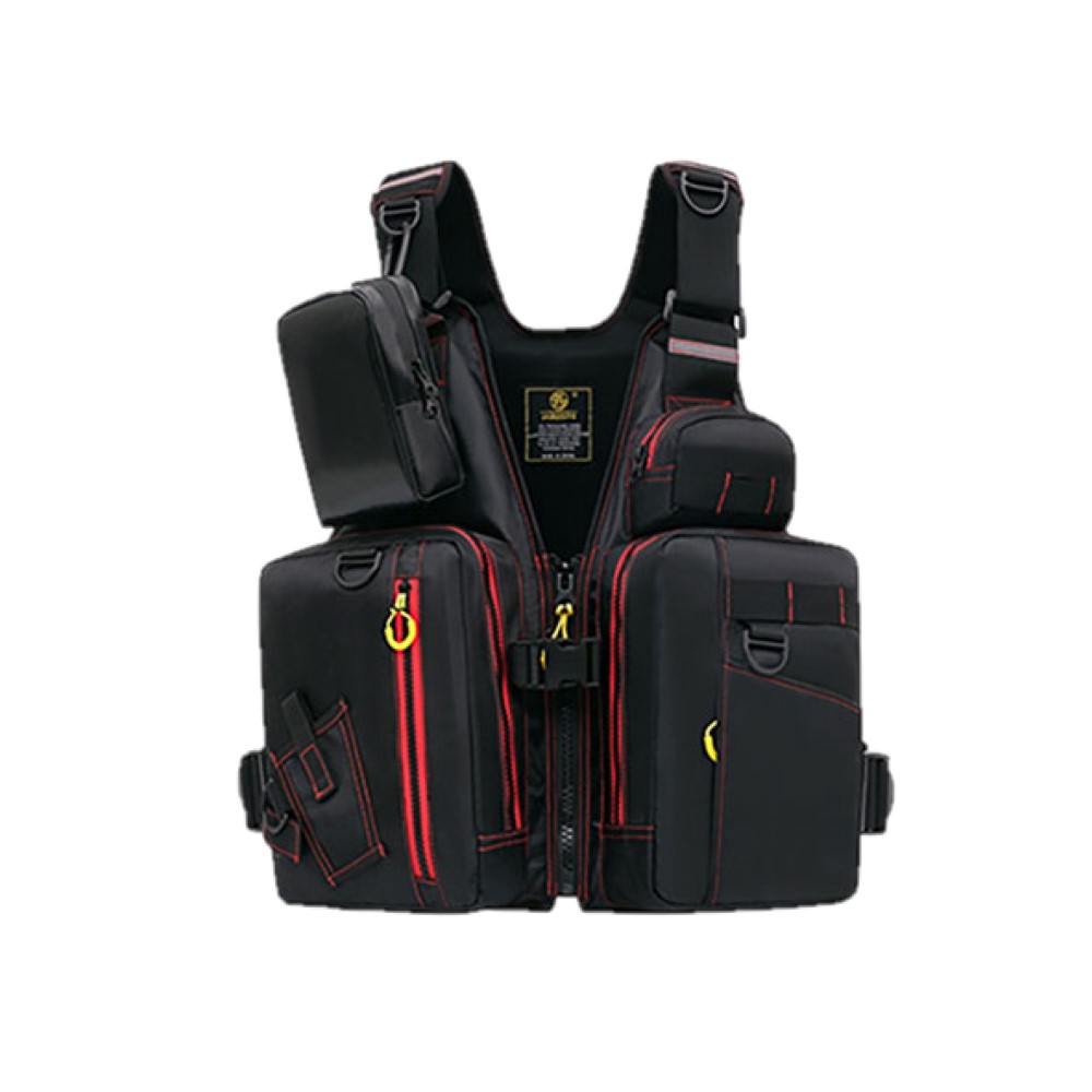 多くの収納を備えた、フローティング機能付きフィッシングベスト。