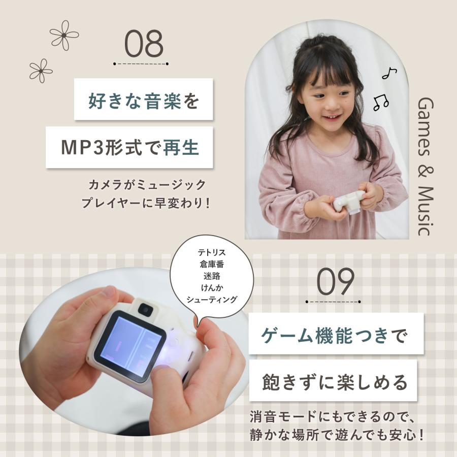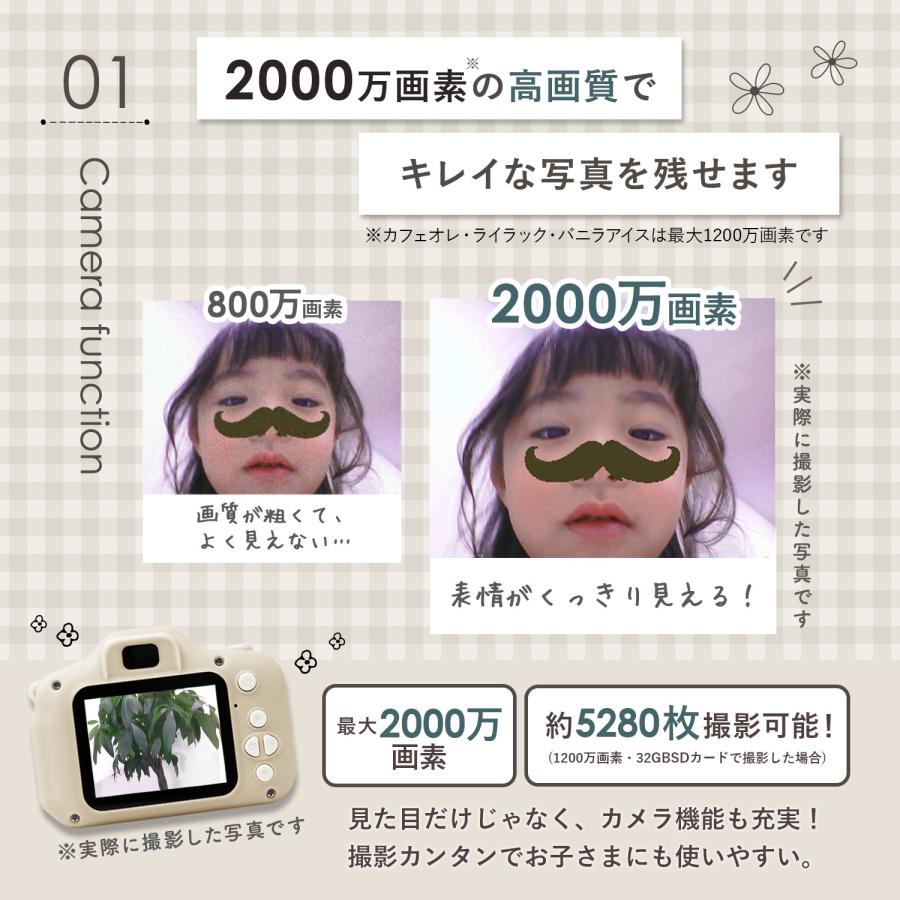 キッズ デジタルカメラ 写真動画 子供用 カメラ 32G SDカード付き ゲーム内蔵 ストラップ付き おもちゃ プレゼント ギフト 届いてすぐに使える、32GB メモリカード付き! 残してあげたい、のぞいてみたい! こども目線の景色が撮れる! インカメラを使って、自撮りや友達同士で集まって記念撮影ができます。 最大1200万画素、約5280枚撮影可能!(1200万画素32GBメモリカードで撮影した場合) 最大1440×1080Pのビデオ撮影で約5時間保存できる!(1080P32GBメモリカードで撮影した場合) お子さまのはじめてのカメラにぴったり♪小さくておもちゃみたいだけど、本格的な機能を兼ね備えたキッズカメラです。 お子さまがカメラを持つことで、大人では見ることのできない、子どもならではの世界観を親子でお楽しみいただけます。またお子さまが自分で写真を撮ることによって、想像力を育み芸術的な感性も身につきます。スマホで写真を撮るのが好きなお子さまに!プレゼントにもおすすめです♪ 子どもが持ちやすいように設計されたとっても小さなサイズ感!本体はシリコン素材なので、滑りにくくお子さまの手にも馴染みやすくなっています。 5種類のゲームも入っているので、長くお楽しみいただけます。 サイズ約8.8×6.1×4.8cm 約95g 仕様機能:写真撮影/ビデオ録画/ゲーム(5種類) ディスプレイ:2インチ IPSスクリーン 画素数:12M/8M/5M/3M/2M/1.3M/VGA 写真解像度:3000×4000 動画解像度:1080P/1440x1080720P/1280x720VGA/640x480 タイムスタンプ:ONOFF 充電時間:3~5時間 連続使用時間:4~5時間 電圧:DC-5V サポートシステム:Windows me/2003/XP/ビスタ/Win7/Win10MacOS Linux ブルー/ピンク/アクアグリーン 画素数200万~2000万画素 ズーム機能4倍 タイマー5秒のみ カフェオレ/バニラアイス/ライラック 画素数100万~1200万画素 ズーム機能8倍 タイマー3510秒 付属品32GB メモリカード メモリカードUSBアダプター ストラップ 日本語取扱説明書 品番 注意カラーの見え方につきましては、お客様のモニターなどの設定により、違って見える場合がございます。 入荷時期により、商品パッケージの仕様が変更になる場合がございます。