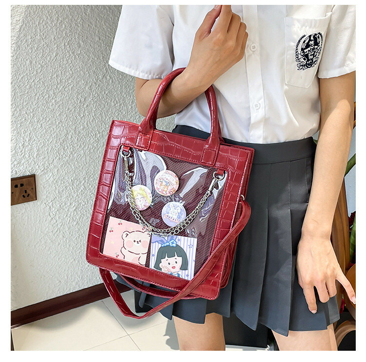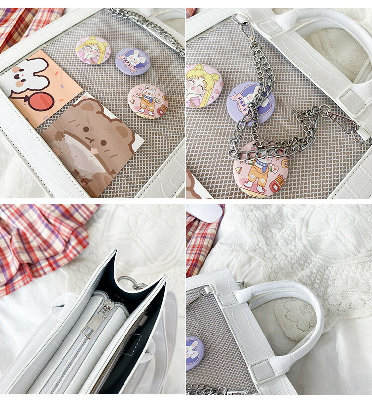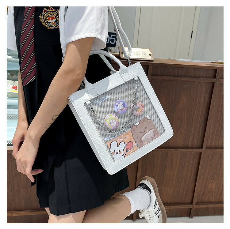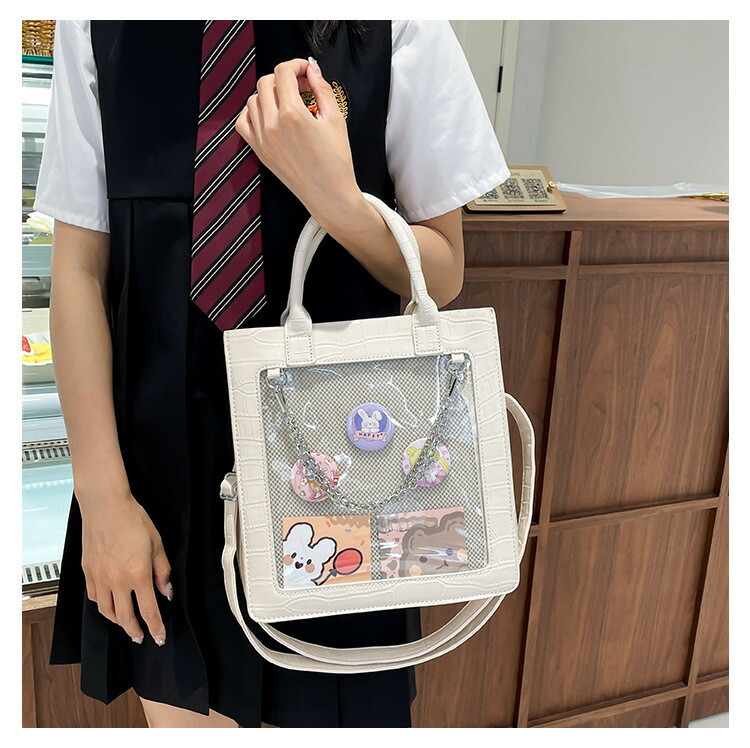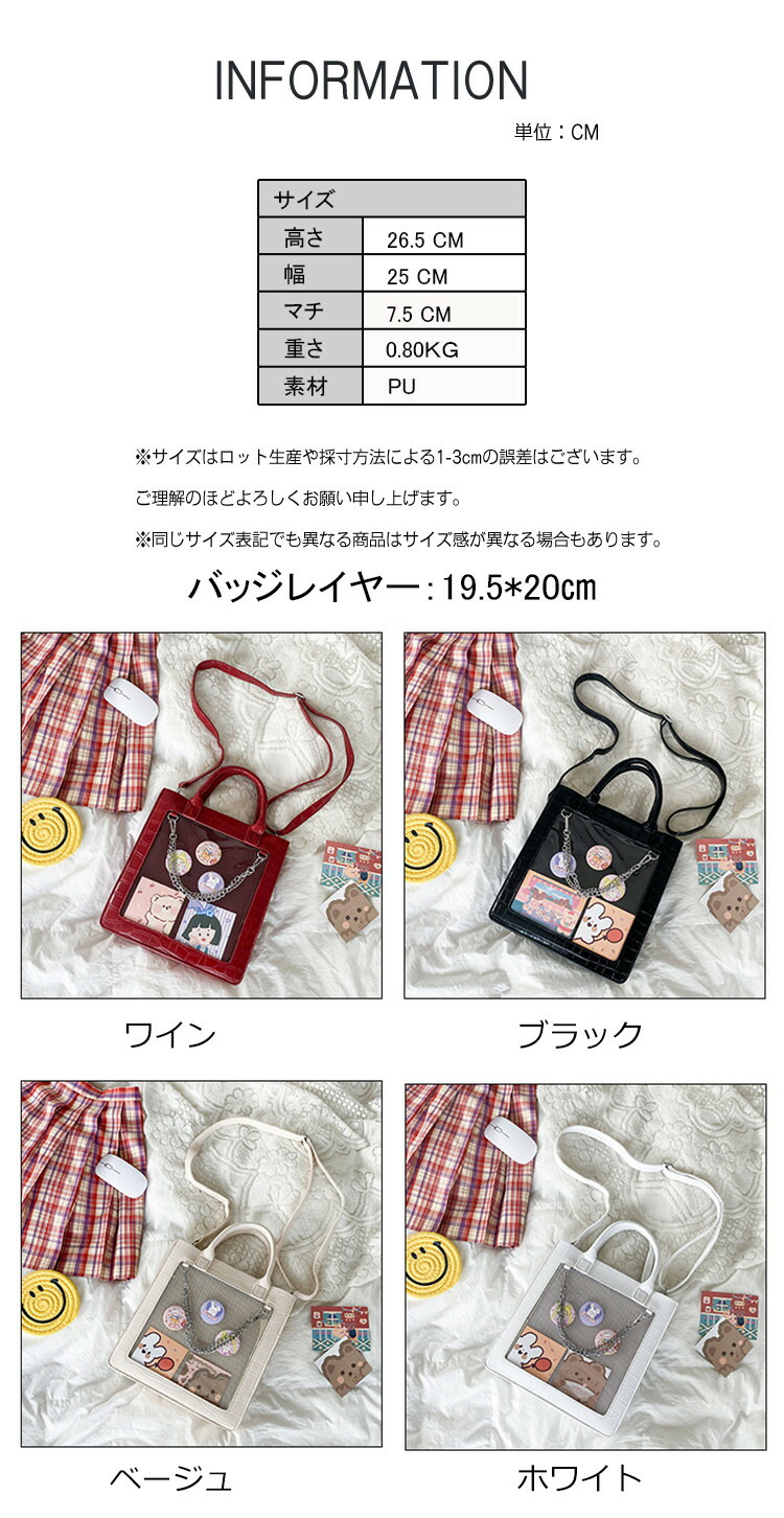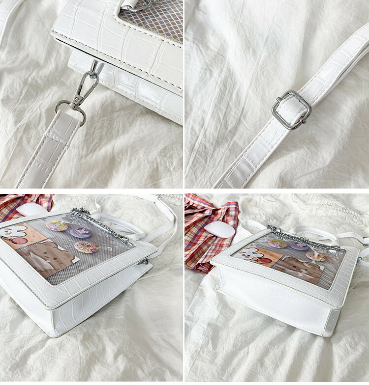 見せバッグ:バッグの前の透明窓で見せたいアイテムを好みにアレンジできます。推しの写真、缶バッジ、ストラップなどを入れて、 マイコレクションをオシャレに持ち歩きましょう。