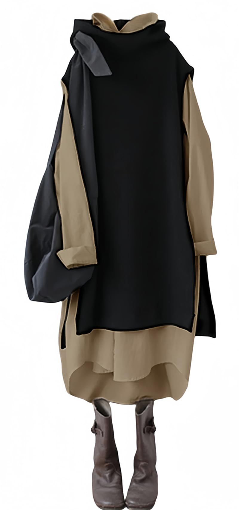 [YUANYUAN] 冬ワンピース レディース パーカーワンピース ロングパーカー ドレス 秋服 冬服 ニット袖 ドッキング フッド付き マキシ丈 カジュアル ゆったり 可愛い オシャレ 着 シンプル