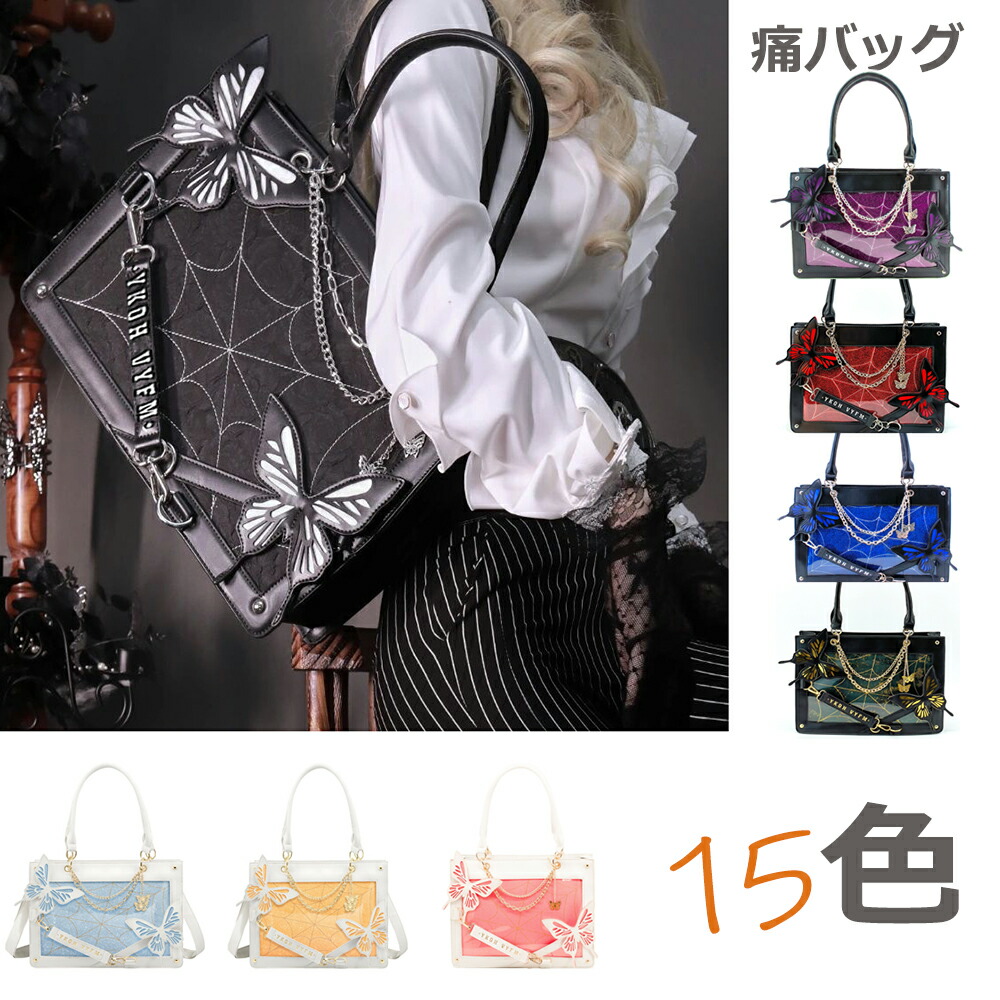 痛バッグ トートバッグ ショルダーバッグ 缶バッチ トート ショルダー PU ゴシック 蝶 おしゃれ お出かけ クリアバッグ デコバッグ 個性的 レディース