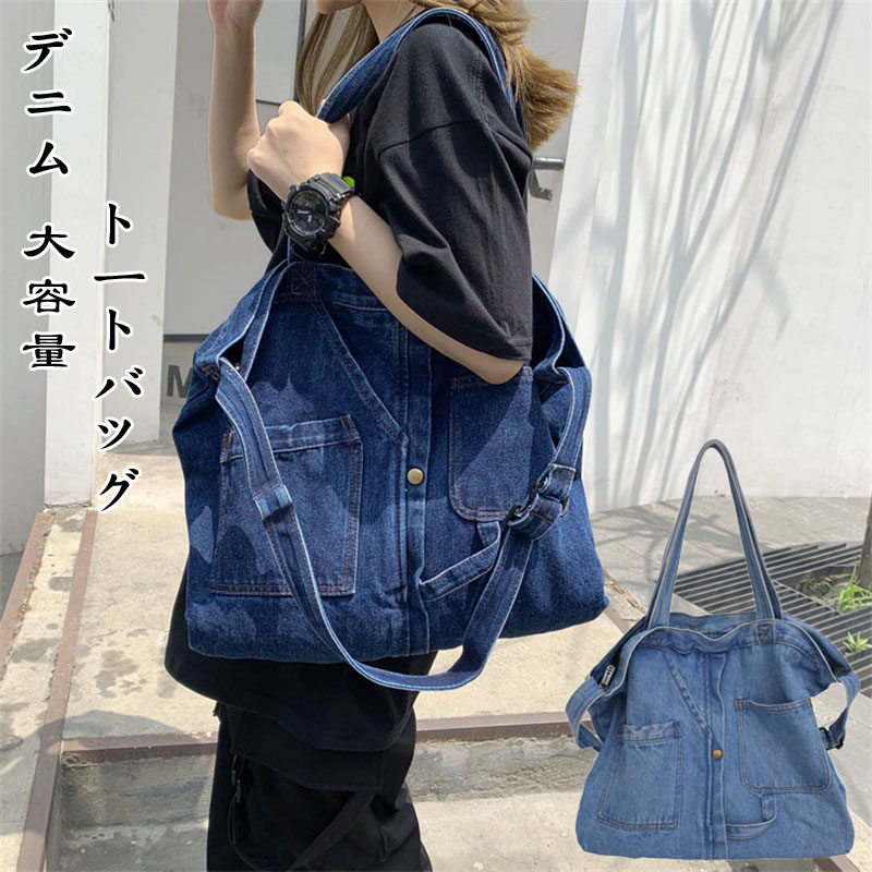 デニムトートバッグ 大容量 大きめ ショルダーバッグ メンズレディース 男女兼用 インディゴ マイバッグ ランチバック ショルダー 斜め掛け 無地 通学 お出かけ ハンドバッグ 2way