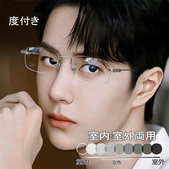 メガネ メンズ おしゃれ 度付き 近視 変色 紫外線カット ふちなし リムレス ブルーライトカット標準搭載 めがね 眼鏡 超軽量 ファッションメガネ フリーサイズ 軽い