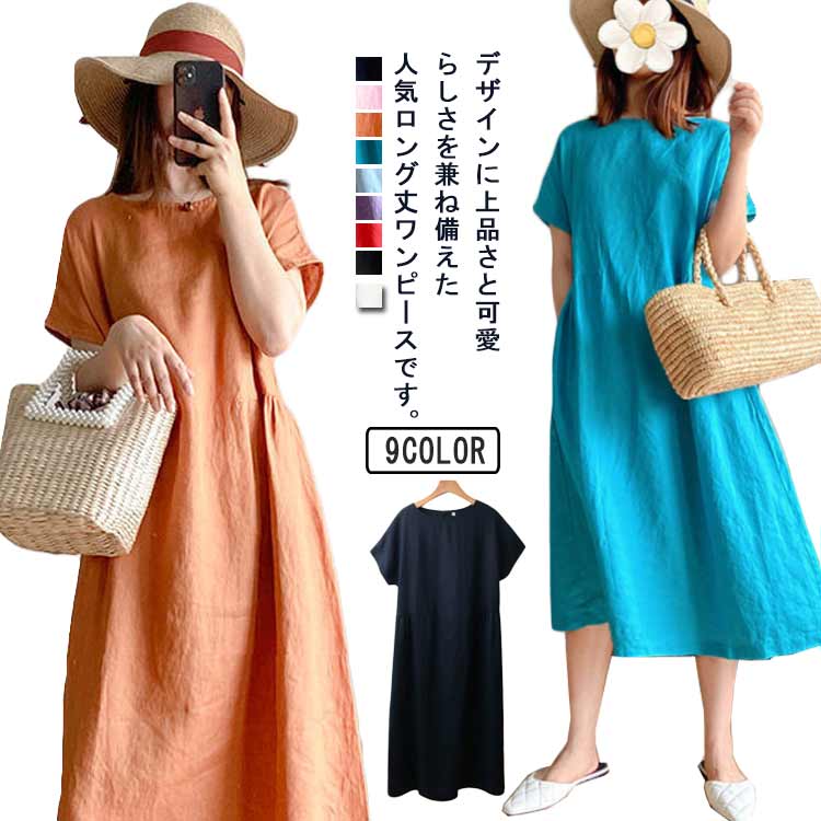 リネンワンピース ナチュラル ワンピース ロング丈ワンピース 半袖 夏ワンピース マキシワンピース 綿麻 麻 リネン ワンピ Aライン 春夏 薄手 シンプル ポケット付き 大きいサイズ 無地