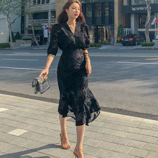 黒 ワンピース ドット フレア マーメイド ドレス