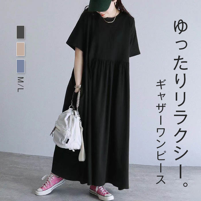 ワンピース 半袖 ロング レディース カットソー 春 夏 ワンピ マキシワンピース ロングワンピース 無地 ロングワンピ ナチュラル マキシ ギャザー クルーネック かジュアル シンプル 体 Tシャツ