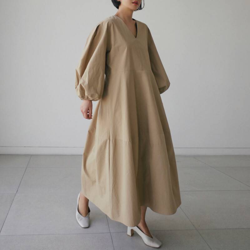 ワンピース ドレス フレアワンピース マキシ丈 バルーンスリーブ ランタンスリーブ 長袖 オーバーサイズ ワイド Aライン Vネック リラックス リゾート コットン 大人女子 モダン こな ナチュラル
