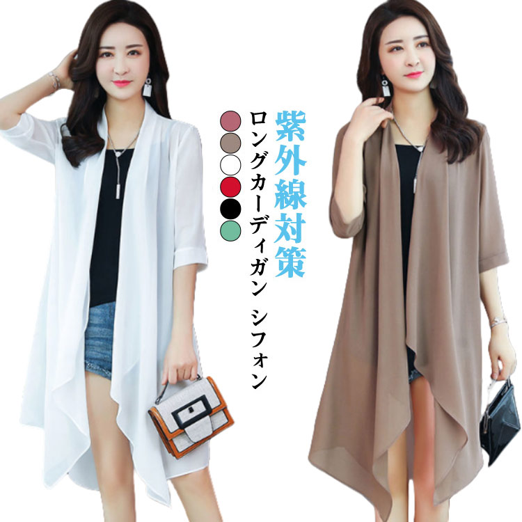 ~3 ロングカーディガン シフォン 7分袖 体型カバー 透け感 紫外線対策