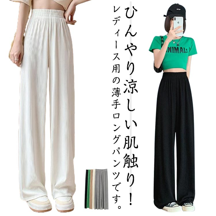 接触冷感 無地 レディース ウエストゴム リブ 涼感 イージーパンツ 春 冷感 ロングパンツ プリーツパンツ 体型カバー 大きいサイズ ワイドパンツ ストレートパンツ おしゃれ 薄手 涼しい 楽ちん