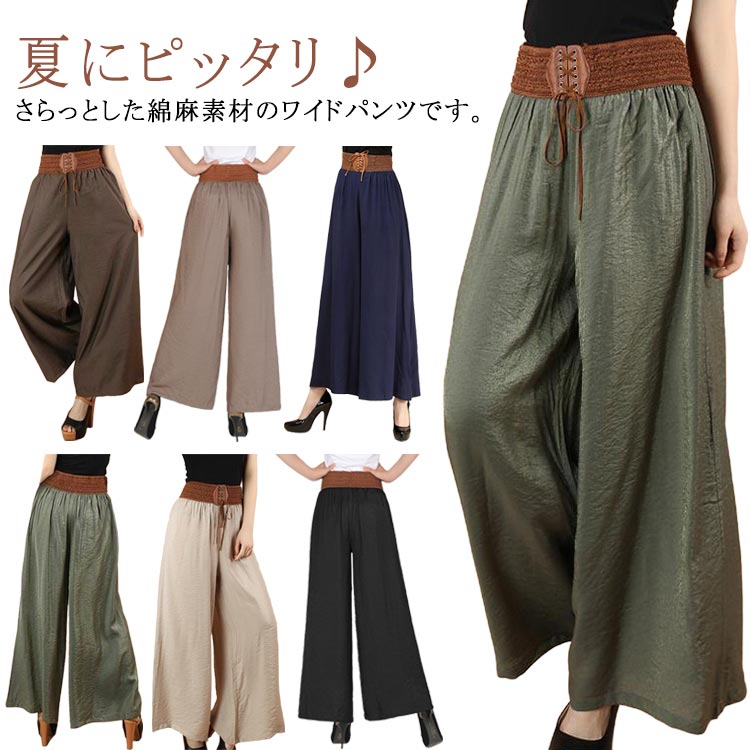 綿麻パンツ 薄手 ワイドパンツ 着瘦せ 美脚 ウエストマークデザイン