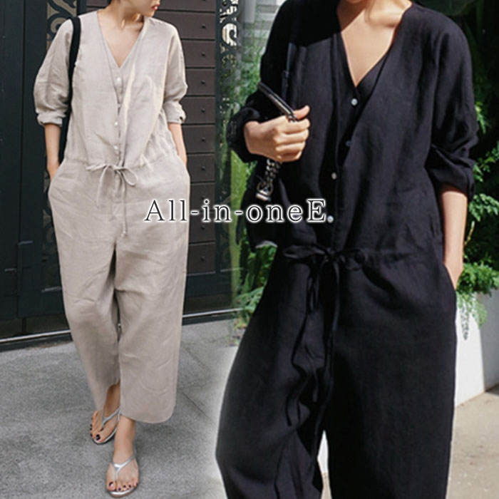 【新丈登場】綿麻風 オールインワンパンツ きれいめ 黒 杏色 ブラック ベージュ ゆったり シンプル 高身長対応 低身長対応 レギュラー丈 ロング丈 20代 30代 40代 50代 送料無料 ♪