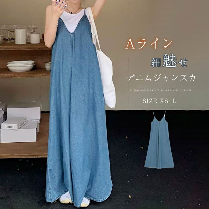 デニムキャミワンピース マキシワンピース ライン ロング丈 ゆる デニムジャンパースカート レイヤード 重ね着 薄手デニム 柔らか 爽やか 夏