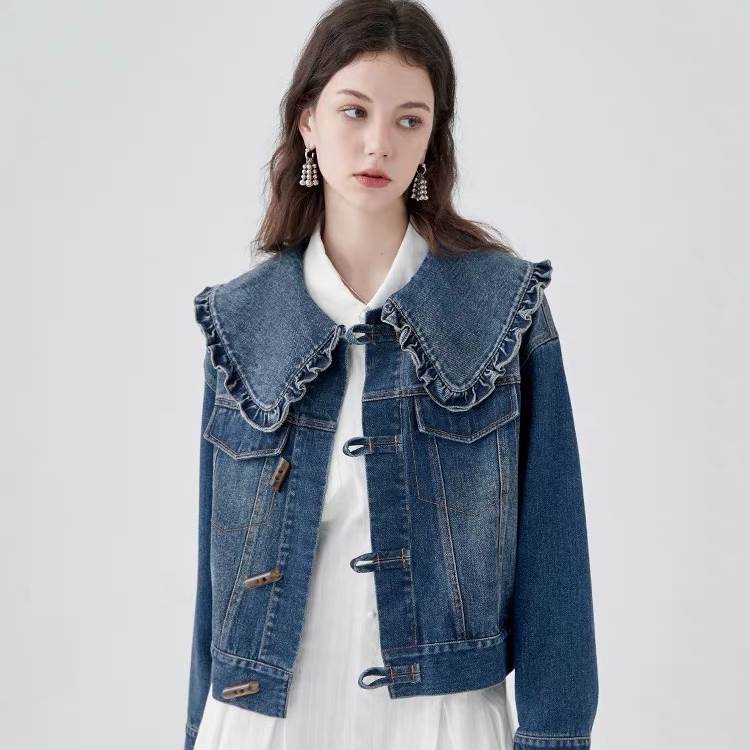 アウター レディース ジャケット ジャンパー ジャン ブルゾン 袖あり 長袖 ビッグカラー フリル 襟付き ボタン 水牛ボタン バッファロー風 ブルーデニム ポケット 個性的 送料無料
