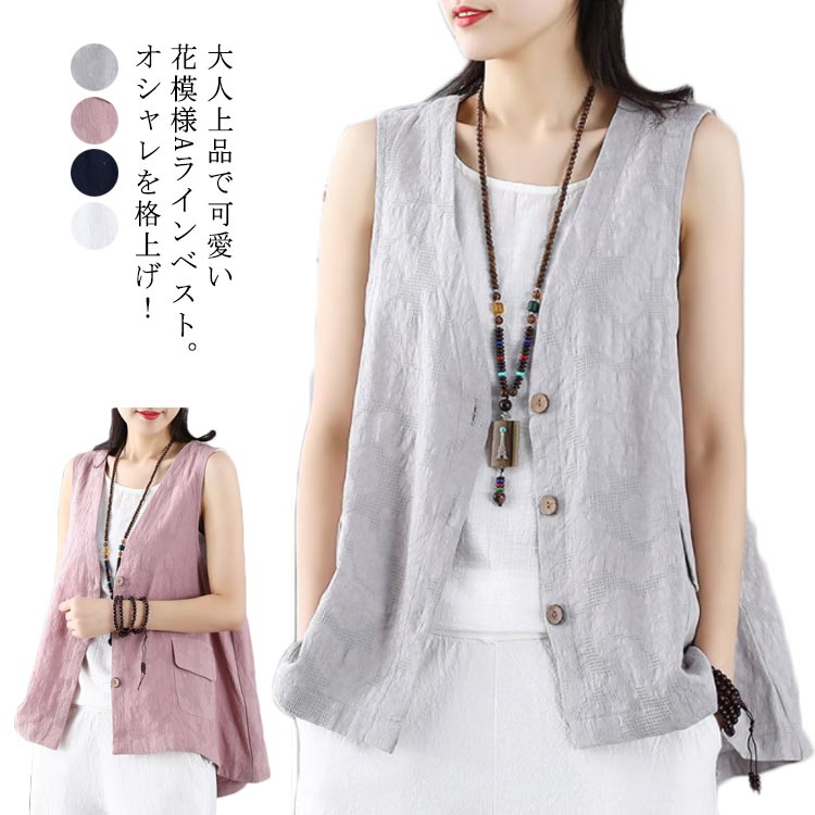 花模様が大人可愛い ジレ リネンベスト 綿麻 薄手 春夏 Aライン 体型カバー レディース ノースリーブ 羽織り サマージャケット 通勤 30代 40 重ね着