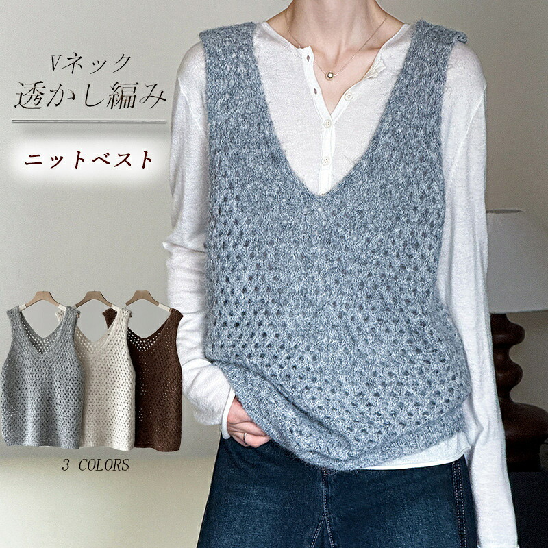 透かし編み ニットベスト Vネック レディース ニット ベスト トップス Vネックニット 重ね着 タンクトップ ノースリーブ Vネックニットベスト 無地 ゆったり 大きいサイズ 体型カバー ロング丈